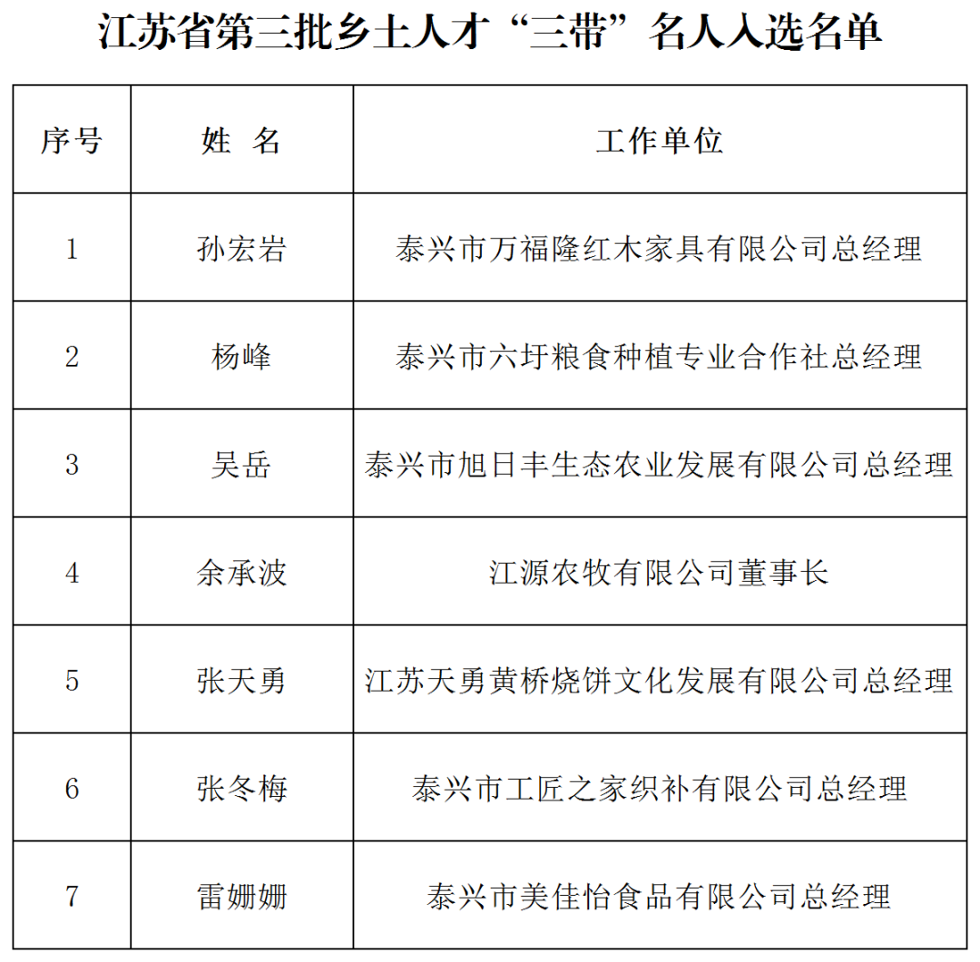 近年来,市委、市政府始终将乡土人才作为乡村振兴的“主力军”和“金种子”,持续推进乡土人才队伍建设,人才培育取得显著成效。前不久,江苏省第三批乡土人才“三带”培养对象评选中,泰兴7名名人、9名能手、33名新秀入选,入选数均列泰州第一。目前,全市拥有江苏省乡土人才“三带”名人9名、能手23名、新秀83名,“三带”人才队伍规模大幅增长。