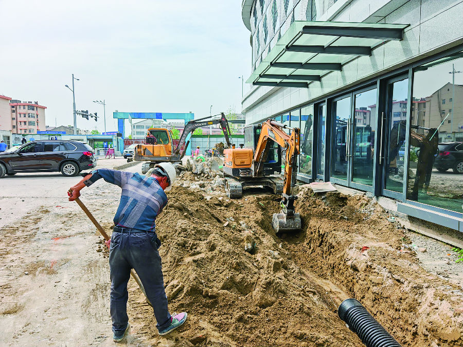图为兴燕路邻里中心项目现场施工人员正在铺设室外雨污水管道