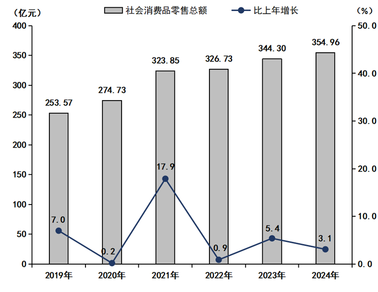 图3:2019-2024年社会消费品零售总额及增长速度